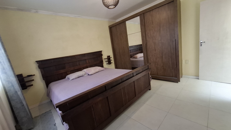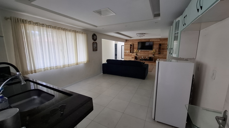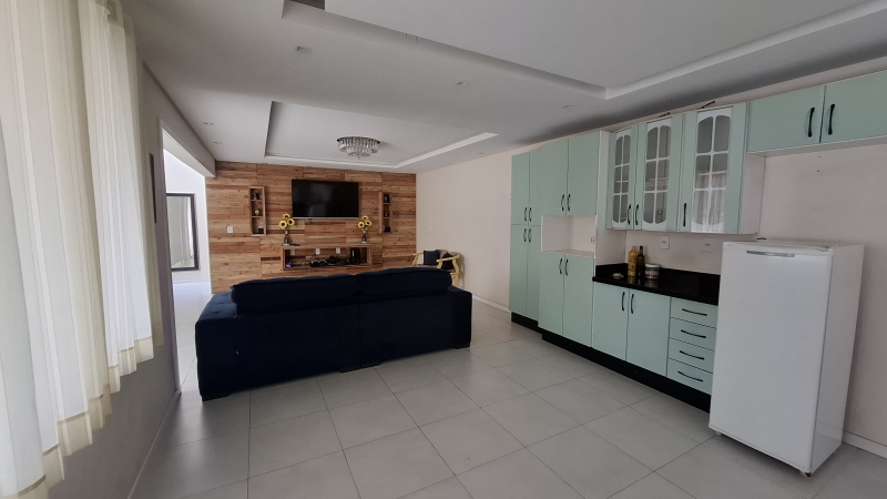 A casa possui dois quartos sendo uma suíte, sala e cozinha conjugadas, área de serviço coberta, churrasqueira, ar condicionado, além de ter uma garagem externa com 30m².